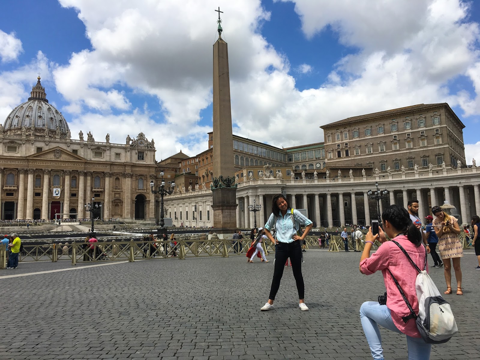 梵蒂冈圣彼德大教堂 St. Peter’s Basilica 前 - “年轻的”我们与700年的教堂和3500-4000年的埃及方尖碑合影 |